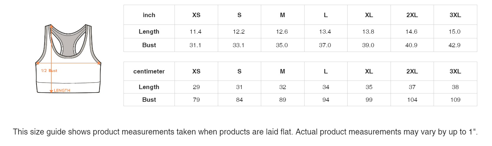 This size guide shows product measurements taken when products are laid flat. Actual product measurements may vary by up to 1".