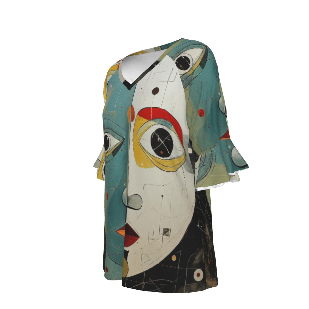 All-Over Print V-neck Women's T-shirt With Bell Sleeve