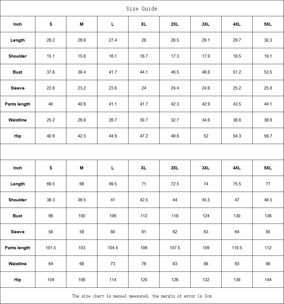 | Inch | S | M | L | XL | 2XL | 3XL | 4XL | 5XL |