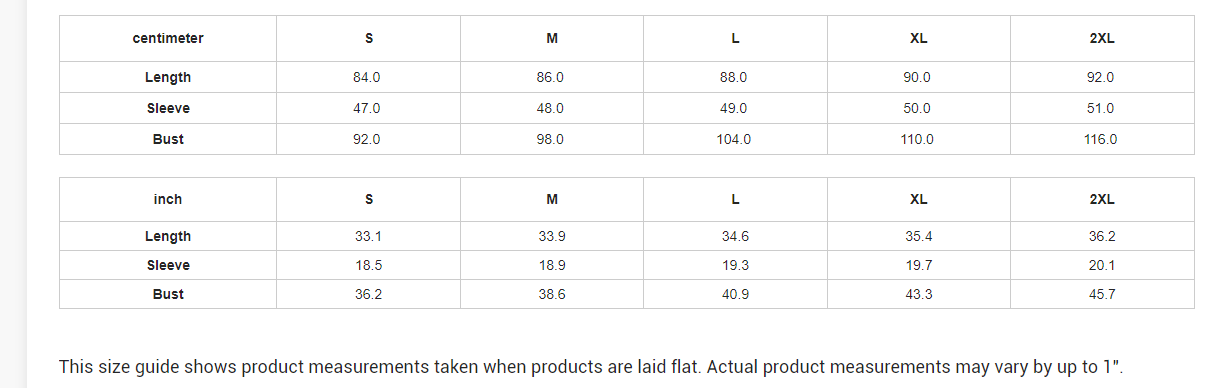centimeter S M L XL 2XL