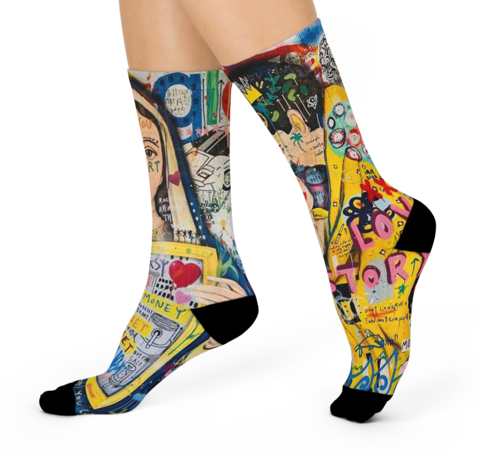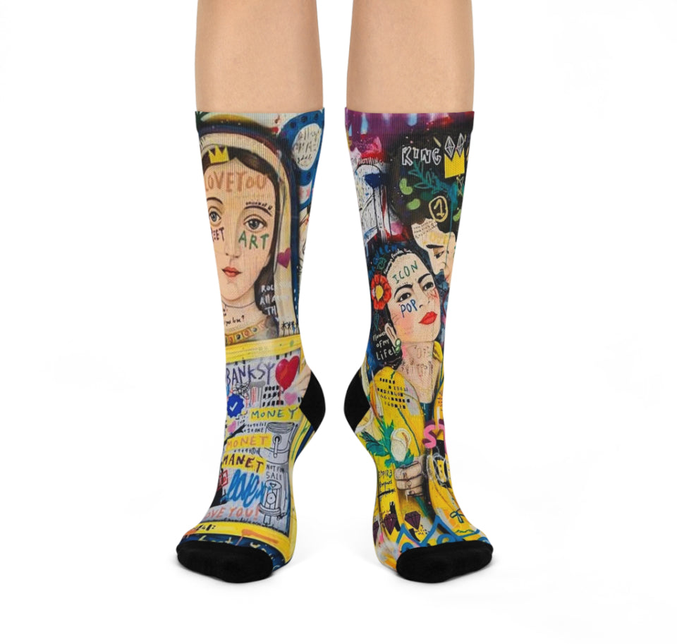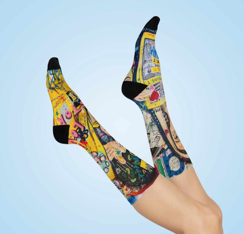 Introducing our premium CREATORS OF ART Crew Socks, the perfect blend of style and functionality. These one-size socks are meticulously crafted with your comfort and appearance in mind. The fully cushioned design ensures unparalleled comfort from heel to toe, while our advanced ArtComfort printing process guarantees sharp, flawless prints without any creases.