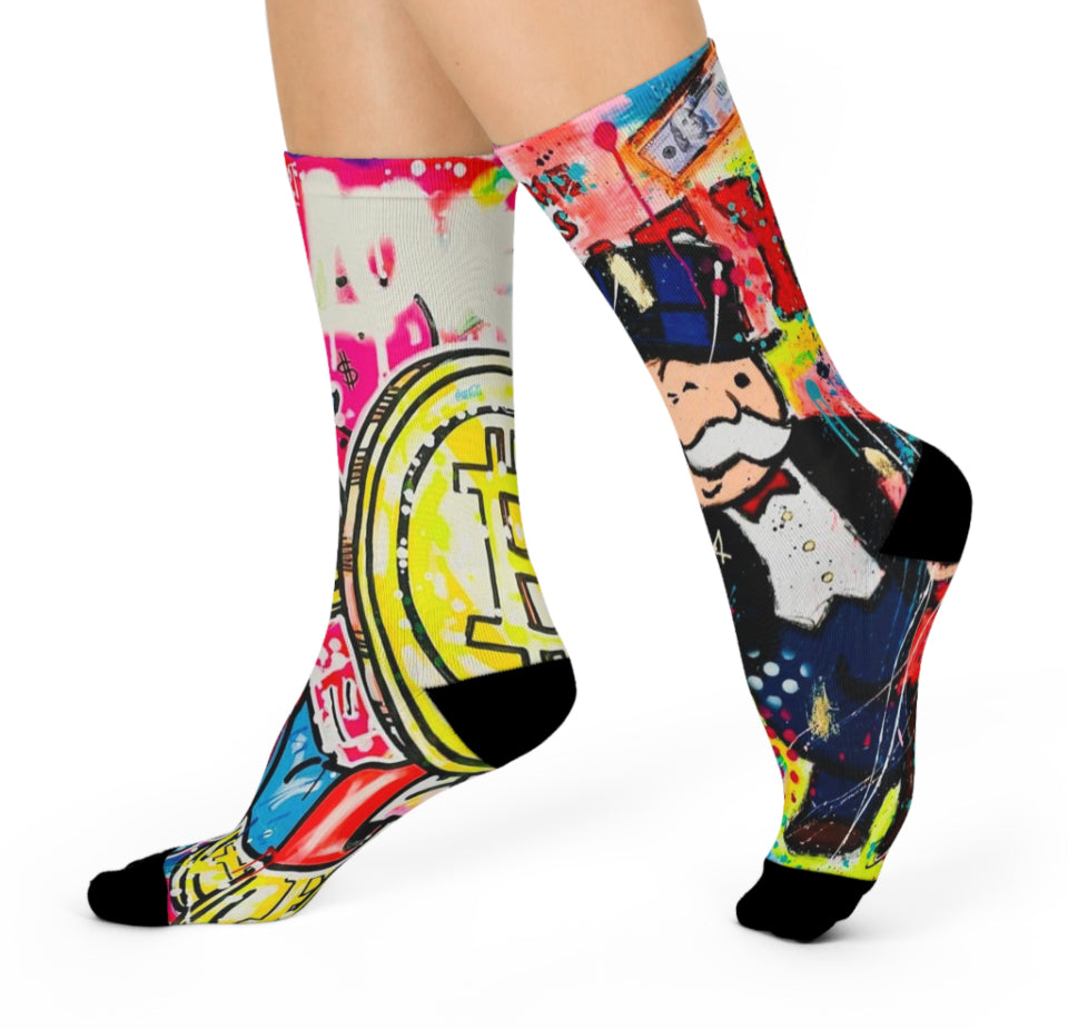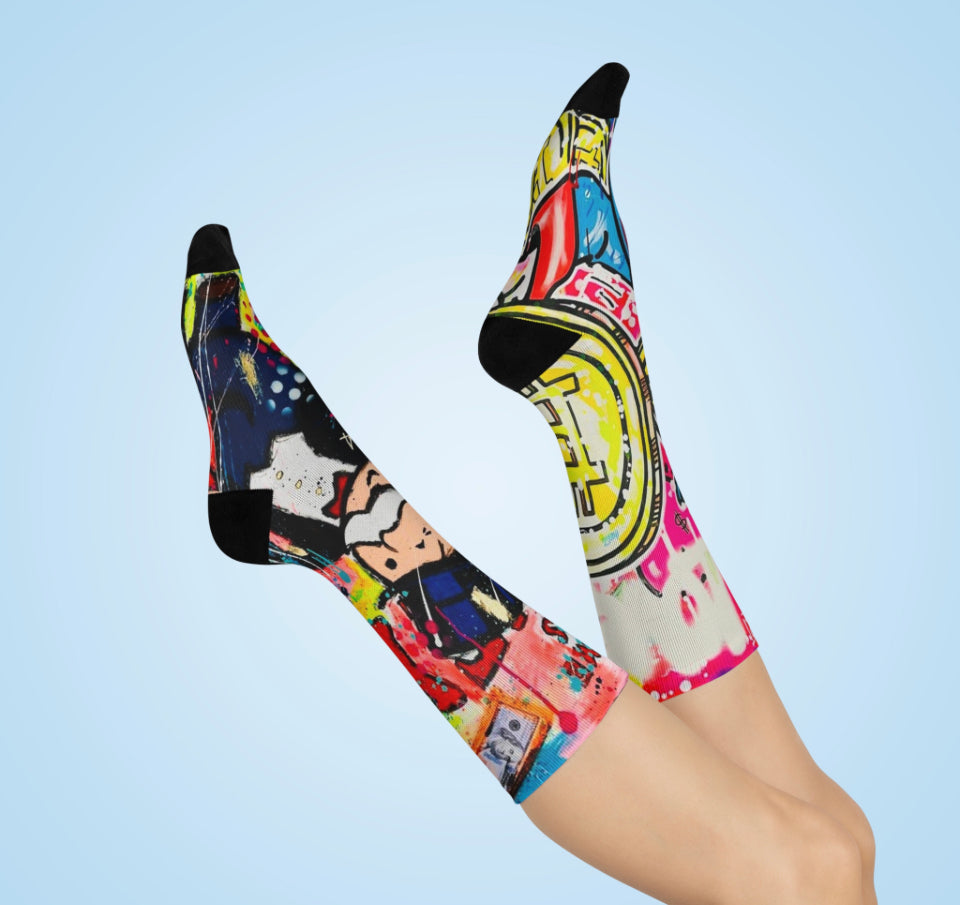 Introducing our premium MONOPOLY MONEY Crew Socks, the perfect blend of style and functionality. These one-size socks are meticulously crafted with your comfort and appearance in mind. The fully cushioned design ensures unparalleled comfort from heel to toe, while our advanced ArtComfort printing process guarantees sharp, flawless prints without any creases.